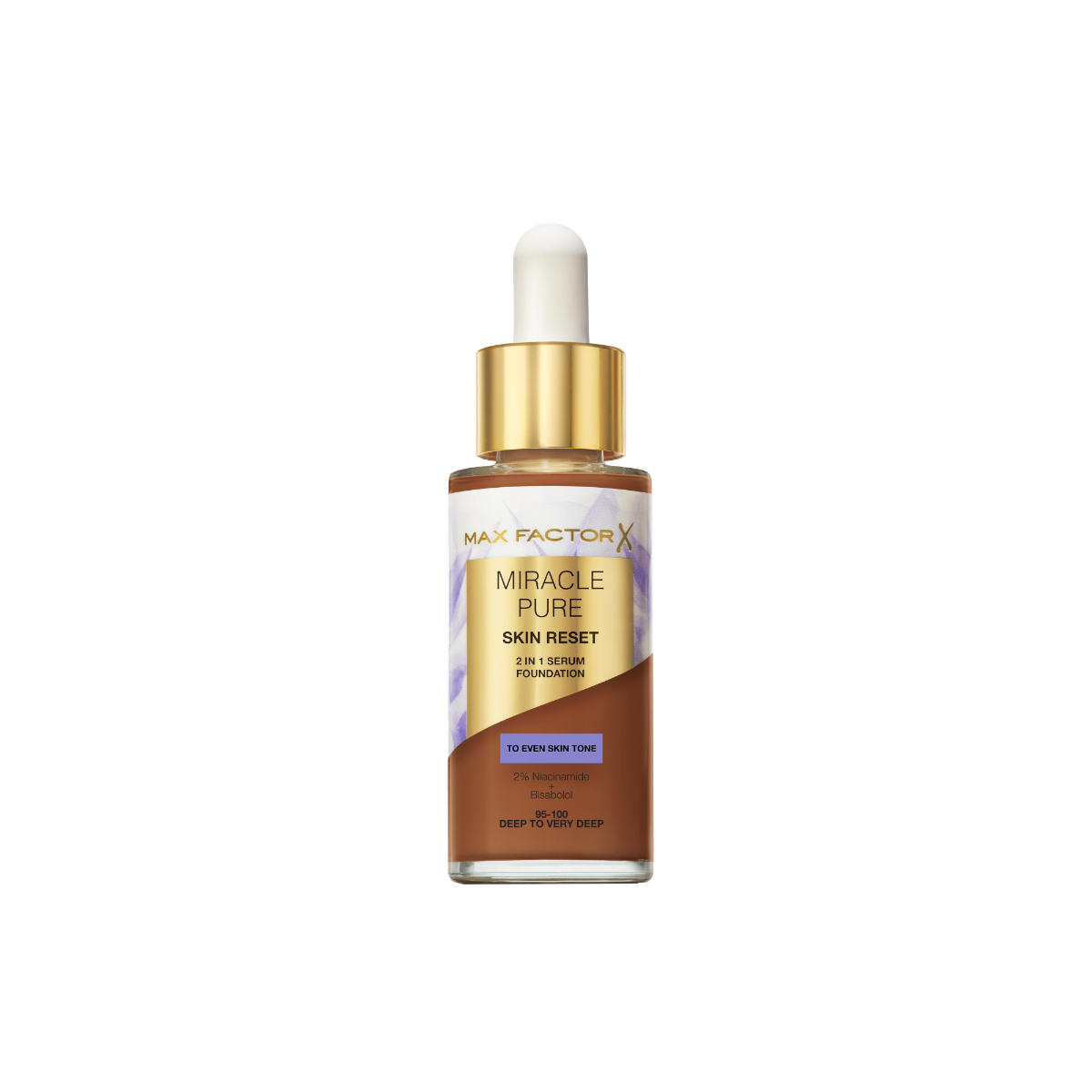 Max Factor Miracle Pure 2in1 Skin Reset Serum Foundation, 95-100, Deep to very Deep, formula vegan, uniforma l’incarnato, copertura media, finish matte satinato, Formula con Niacinamide e Bisabololo, 30 ml