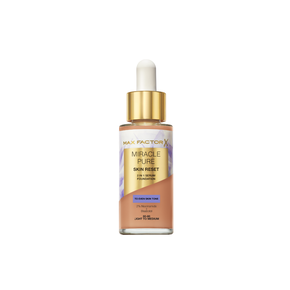 Max Factor Miracle Pure 2in1 Skin Reset Serum Foundation, 60-80 Light to Medium , formula vegan, uniforma l’incarnato, copertura media, finish matte satinato, Formula con Niacinamide e Bisabololo, 30 ml