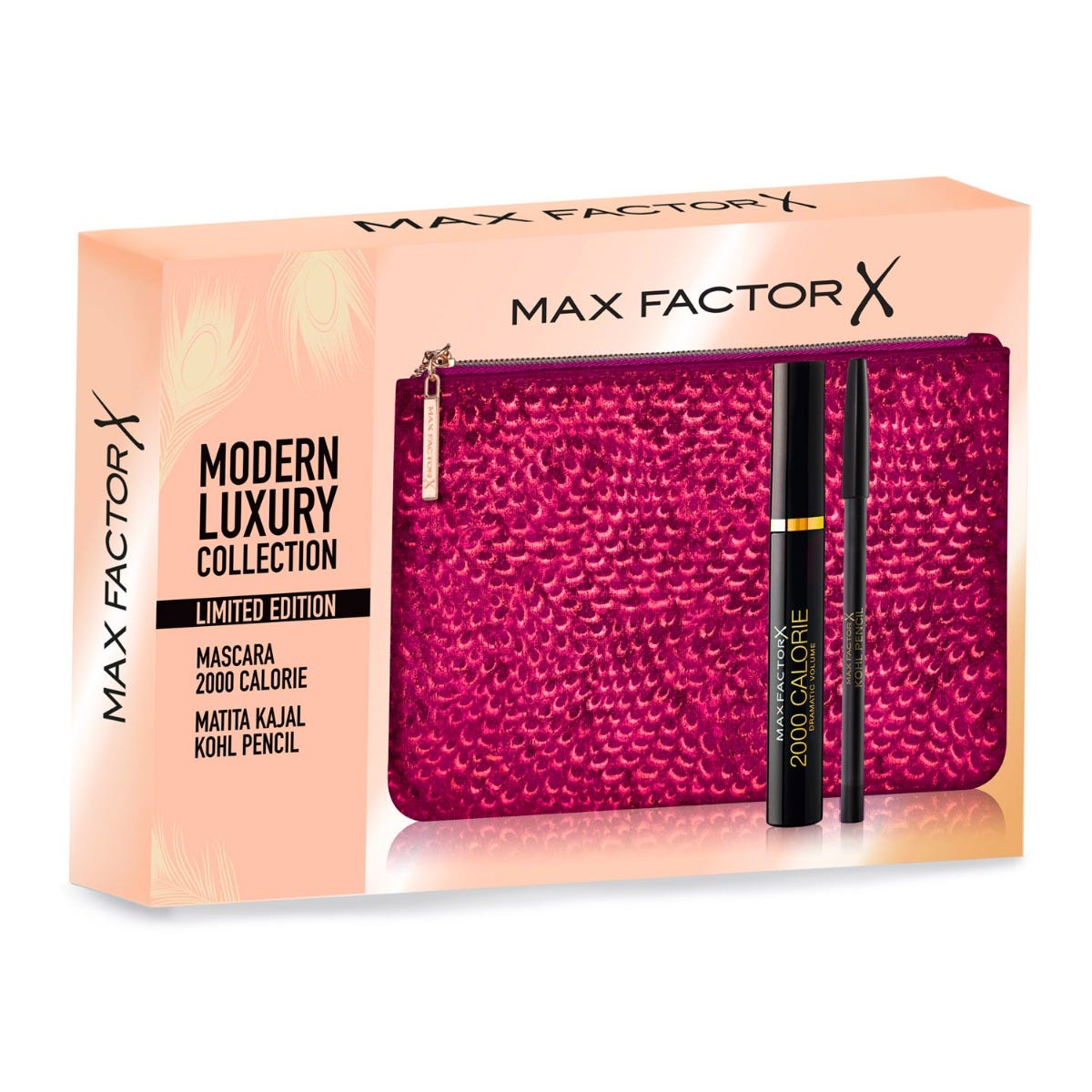 L’elegante pochette in morbido velluto magenta contiene il mascara 2000 Calorie di Max Factor e la matita occhi Kajal Kohl...