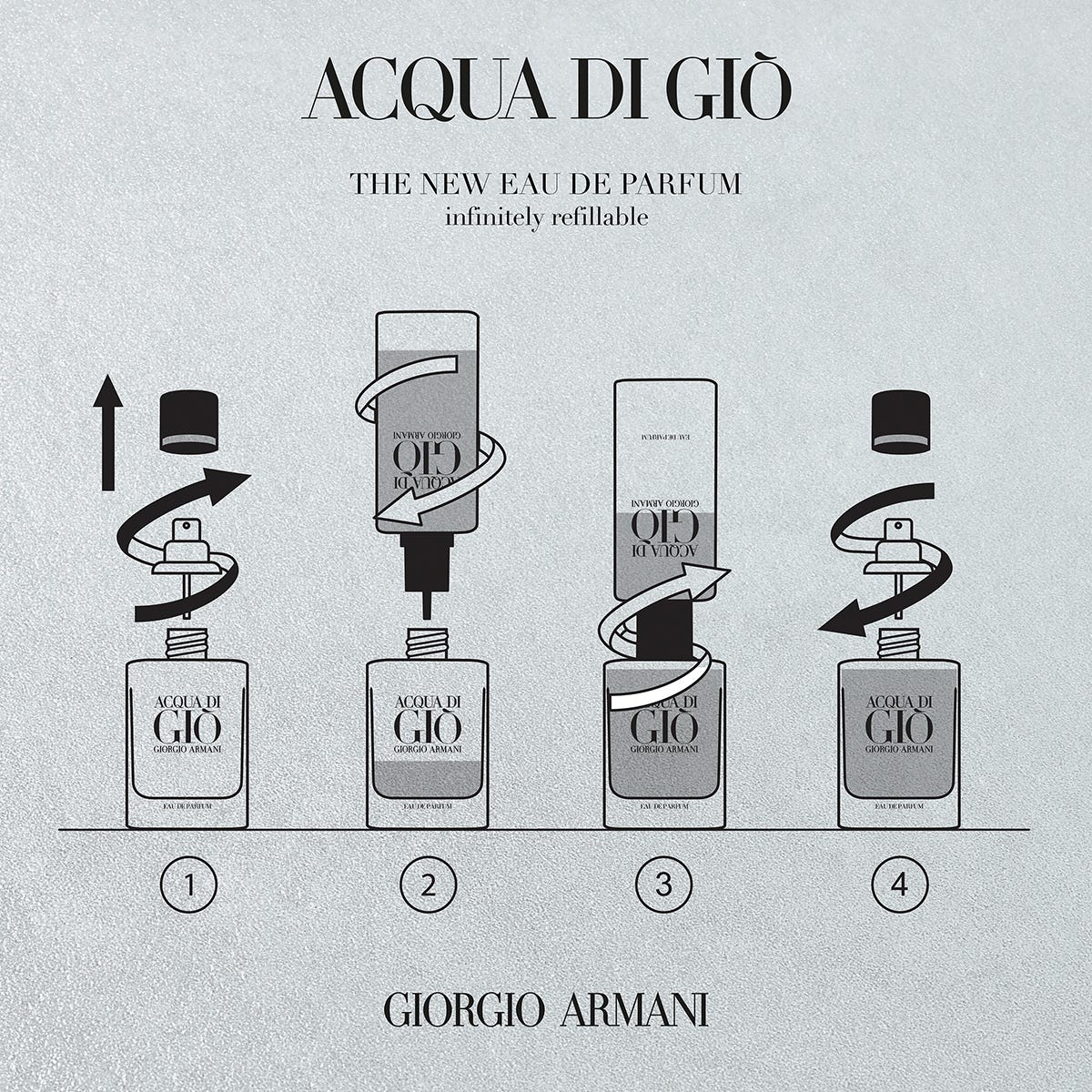 Questa preziosa fragranza è concepita per durare: ciascun formato di ACQUA DI GIÒ EAU DE PARFUM – 40 ml, 75 ml o 125 ml – è progettato per essere svitato e ricaricato a casa con il flacone di ricarica da 150 ml in vendita separatamente.